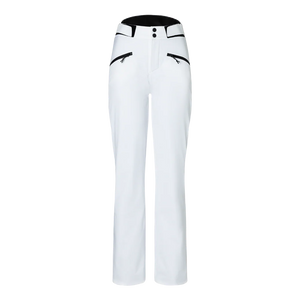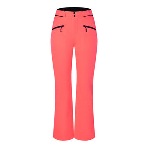 Straight cut featuring fastens with a zip, two FIRE+ICE press studs and hooks, waistband slightly raised and padded at the back, adjustable width with side Velcro fasteners and elasticated tapes, two zipped side pockets, snow skirt with elasticated hem, underlaid zip