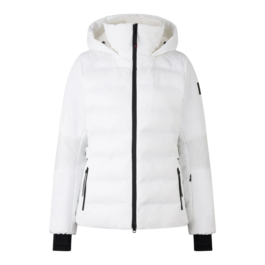 Ski jacket in a regular fit in a design mix of quilted and smooth sections featuring padded stand-up collar, fixed hood with drawstring and stopper, long sleeves, elasticated cuffs with inserted thumb loop, underlaid two-way zip with B pendant, one seam-covered