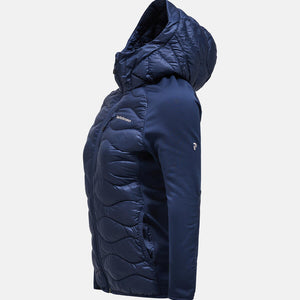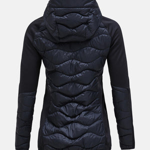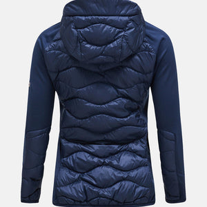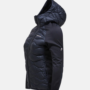 Chinguard, Duck down, 700 fill power, 90/10 down/feather, Elastic binding at bottom hem, Elastic cuffs, Full front with reversed YKK coil zipper, Hanger loop outside neck, Hood with drawcord adjuster, Hybrid, Jersey panels, Lightweight, 42 gsm 20D ripstop. Windproof and repels light rain, Made without intentionally added PFAS, Midweight, 271 gsm flat fleece, soft brushed back that traps warm air. Dries quickly, Open hand pockets, P-logo embroidery at sleeve, Peak Performance embroidery at chest, Quilted in our iconic Helium pattern, Responsible down standard, Side panels in polyester jersey, Soft, midweight polyester fleece with brushed back, Sterilization Permit no. PA 9900(CN), Ultralight nylon ripstop, wind and water resistant, Zippered chest pocket