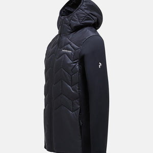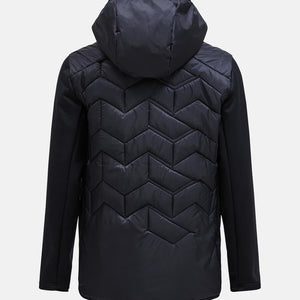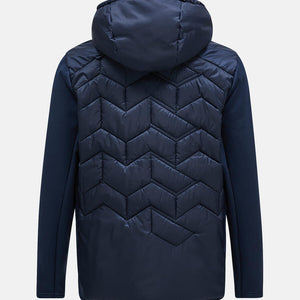 Body - 133 gr/m2, Chinguard, Elastic binding at bottom hem, Fixed Hood, Full front with reversed YKK coil zipper, Hanger loop at back, Hood - 60 gr/m2, Hybrid, Jersey panels, Lightweight recycled polyester ripstop, wind and water resistant, Made without intentionally added PFAS, One-way (width) adjustable hood, P-logo embroidery at sleeve, Peak Performance embroidery at chest, Quilted in P-logo pattern, Recycled fibers, Recycled insulation, Repair patch included, Sleeve hems with thumbhole, Synthetic sheet insulation., Zippered hand pockets