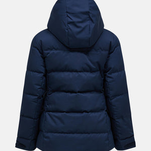 Adjustable drawcord at bottom hem, Adjustable sleeve hem with velcro straps, Duck down, 700 fill power, 90/10 down/feather, Elastic wrist gaiters, Fixed Hood, Fixed snow skirt with snap-in ski pant system, Full front with reversed YKK coil zipper, Goggle wiper, Hanger loop inside neck, Inner mesh stash pocket, Made without intentionally added PFAS, One-way (height) adjustable hood, One-way (width) adjustable hood, P-logo embroidery at sleeve, Peak Performance embroidery at chest, RECCO® Rescue System reflector, Responsible down standard, Soft fleece lined chin protection, Sterilization Permit no. PA 9900(CN), Zippered hand pockets under flap, Zippered inner pocket, Zippered ski pass pocket